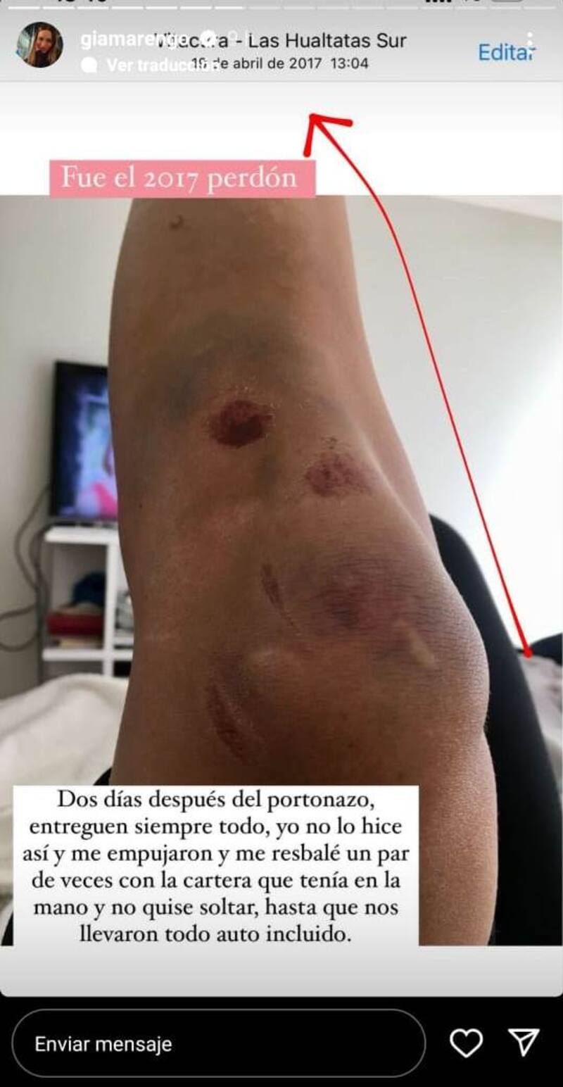 “Fue el 2017, perdón. Dos días después del portonazo… entreguen siempre todo, yo no lo hice así y me empujaron y me resbalé un par de veces con la cartera que tenía en la mano y no quise soltar, hasta que nos llevaron todo. Auto incluido”, expresó la joven mostrando las lesiones tras el asalto.