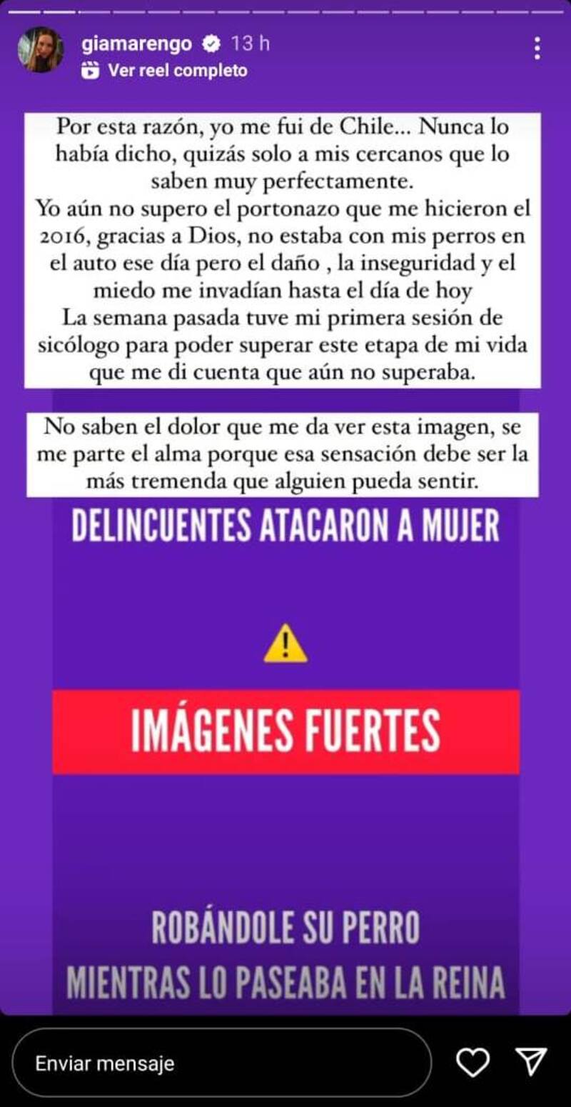 “Por esta razón yo me fui de Chile… Nunca lo había dicho, quizás solo a mis cercanos, que lo saben muy perfectamente. Yo aún no supero el portonazo que me hicieron el 2016, gracias a Dios, no estaba con mis perros en el auto ese día, pero el daño, la inseguridad y el miedo me invadían hasta el día de hoy”, detalló.