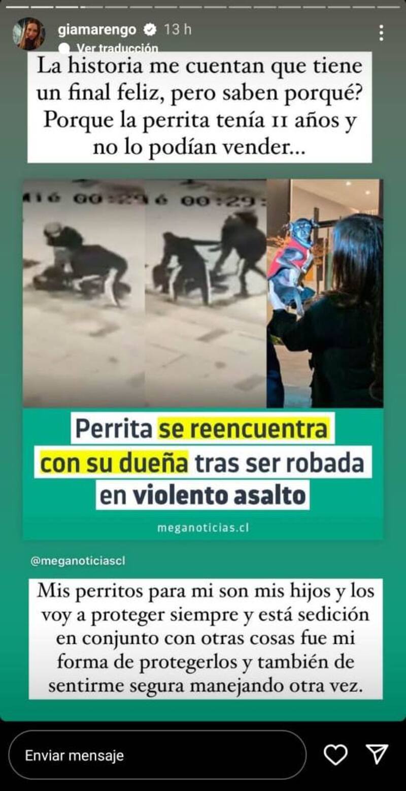 A través de sus historias de Instagram, la ex participante de Aquí se Baila reaccionó a una triste noticia de unos sujetos que atacaron a una mujer mientras paseaba a su perrito, robándole su mascota en La Reina.