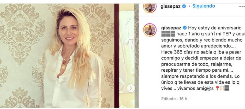 “Hoy estoy de aniversario. Hace un año que sufrí mi TEP y aquí seguimos, dando y recibiendo mucho amor y sobretodo agradeciendo”, escribió de entrada Gissella en su cuenta de Instagram.