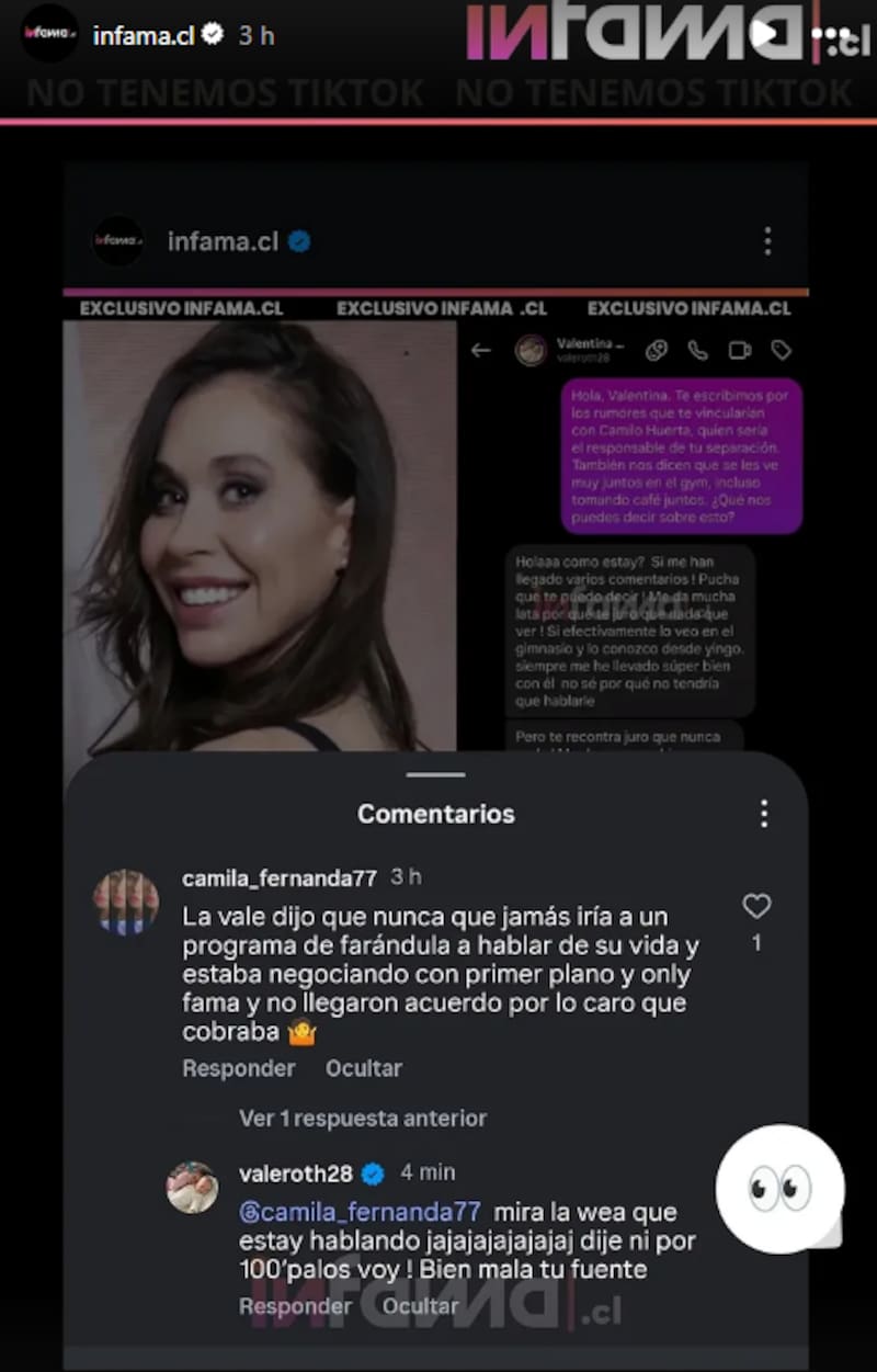 En la misma publicación, Vale respondió: “Mira la weá que estay hablando jajajajajaj. Dije ni por 100 palos voy! Bien mala tu fuente (sic)”.