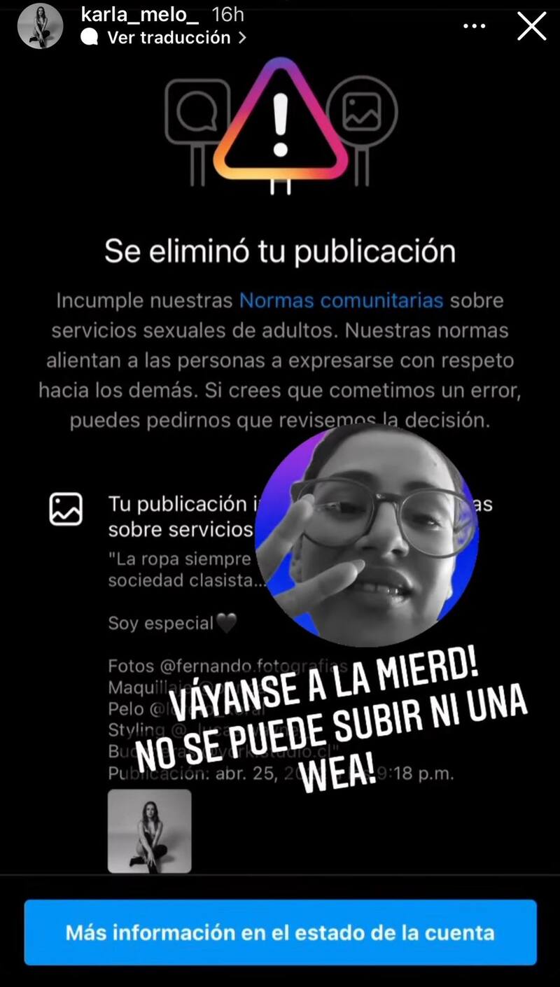 “Váyanse a la mier… no se puede subir ni una hue…”, escribió la ex Aquí se baila junto a un pantalla donde la red social le informa que bajó su contenido por “incumplir las normas comunitarias”. En concreto, pusieron el grito en el cuelo por una postal en la que, para la red social, mostraba más de la cuenta.