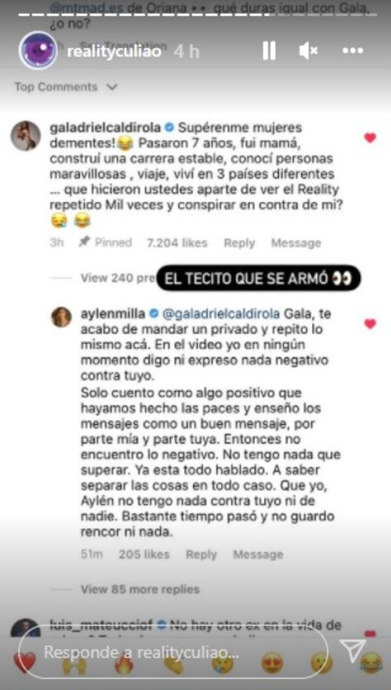 La ex chica reality Aylén Milla alzó la voz luego de que Gala Caldirola se molestara por el video que realizó junto a Oriana Marzoli recordando su rivalidad en “¿Volverías con tu Ex?”.