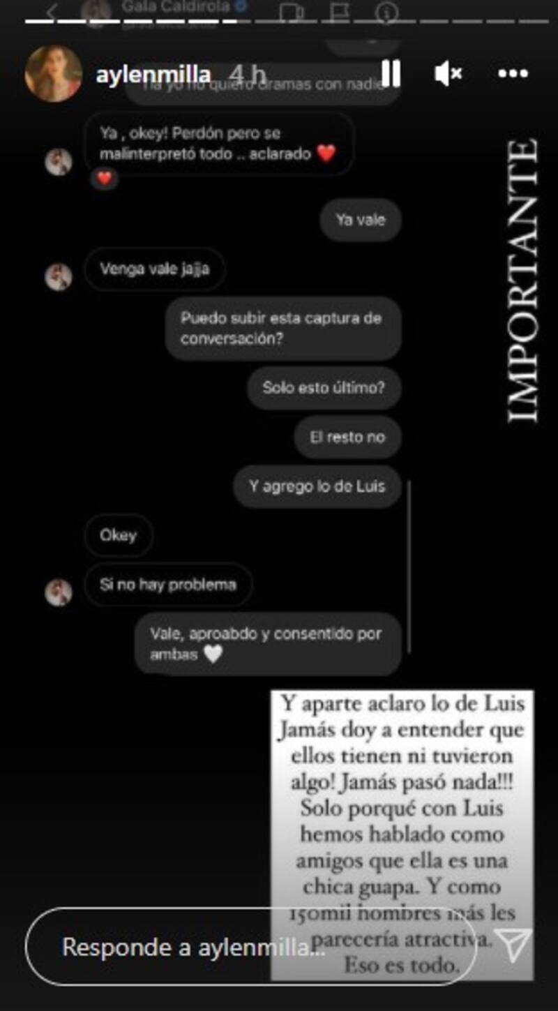“Y aparte aclaro lo de Luis, Jamás doy a entender que ellos tienen ni tuvieron algo ¡Jamás pasó nada! Solo porque con él hemos hablado como amigos, que ella es una chica guapa y como 150 mil hombres más les parecería atractiva. Eso es todo”, añadió Aylén Milla, buscando poner fin a la polémica.