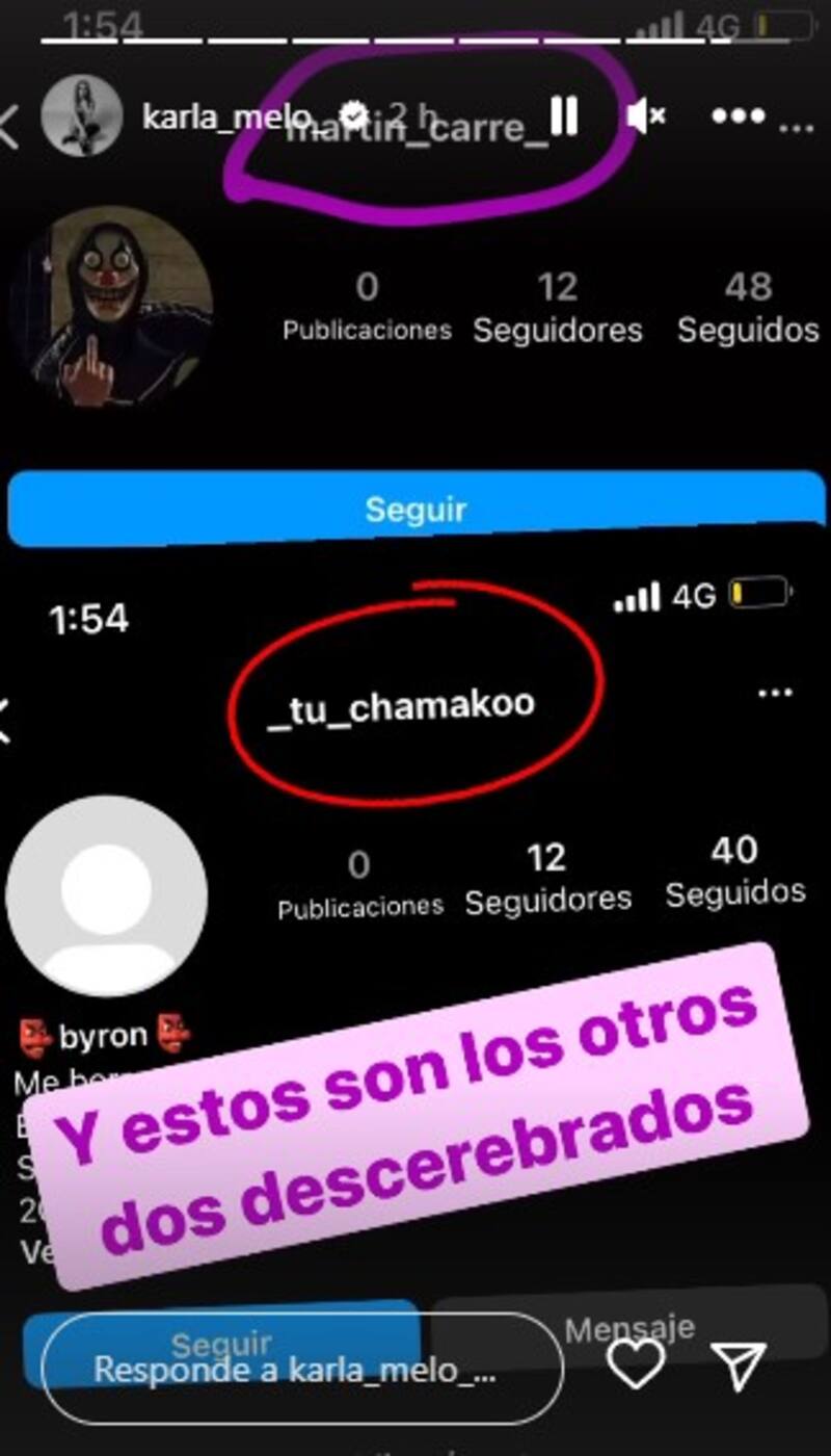 La actriz Karla Melo utilizó sus redes sociales para exponer a dos usuarios que le enviaron mensajes indebidos, dejando en evidencia su molestia.