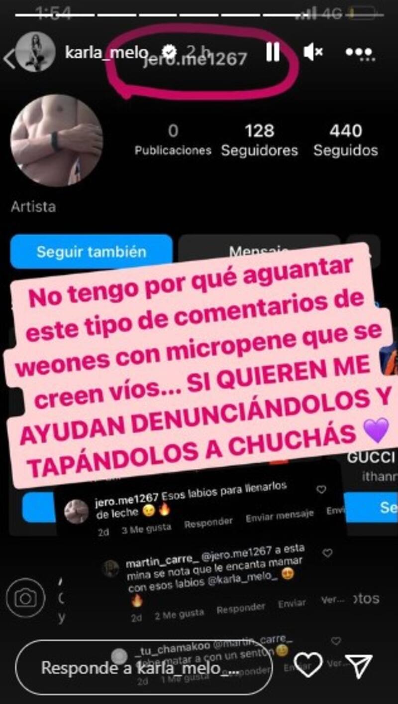 “No tengo por qué aguantar este tipo de comentarios de we… con micropene que se creen víos… SI QUIEREN ME AYUDAN DENUNCIÁNDOLOS Y TAPÁNDOLOS A CHUCHÁS”, expresó la influencer.