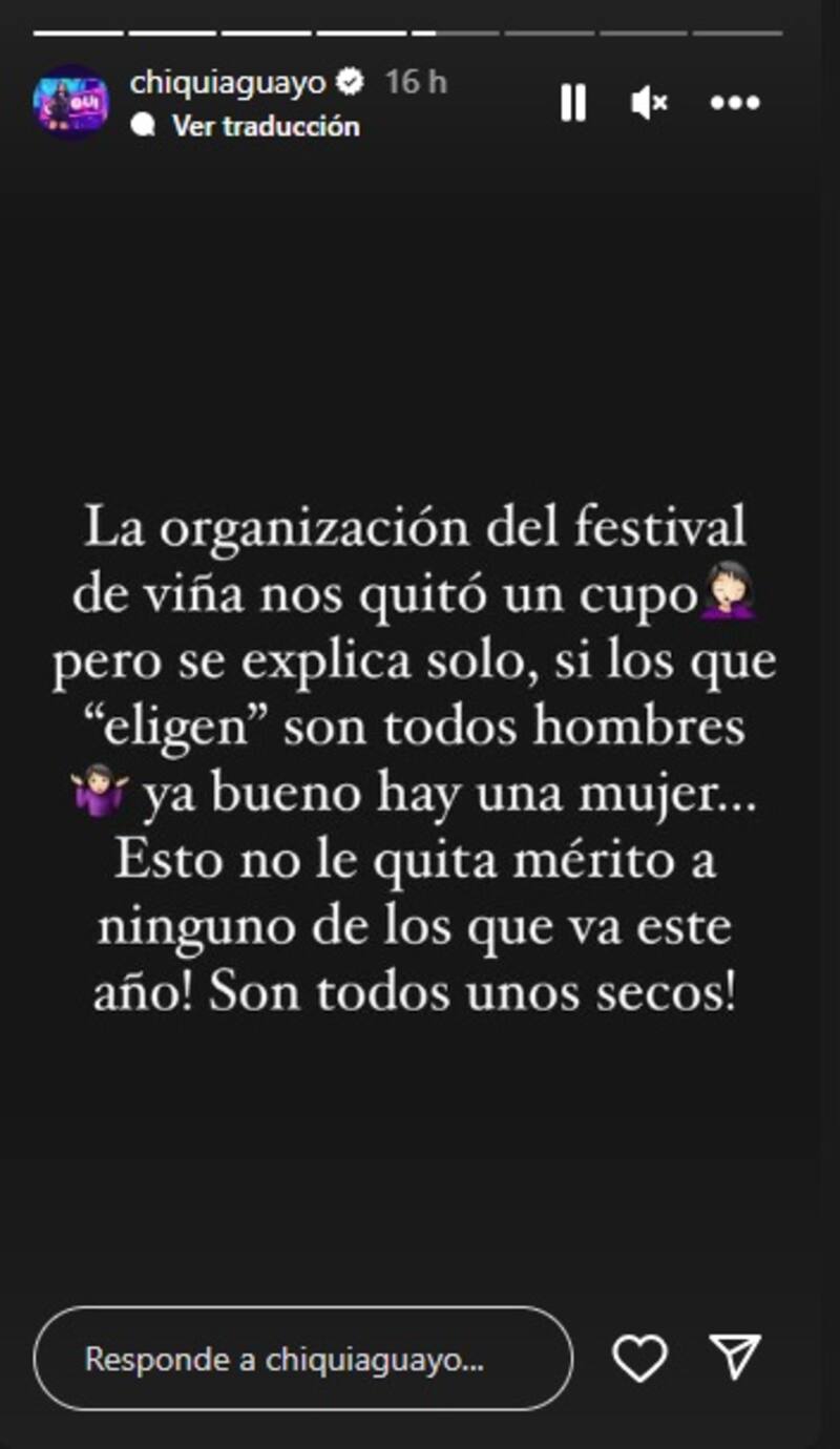 Cabe mencionar que no fue la única que criticó la menor presencia de mujeres en el certamen este año, ya que Natalia Valdebenito también se refirió a la situación a través de su cuenta de X (Twitter).