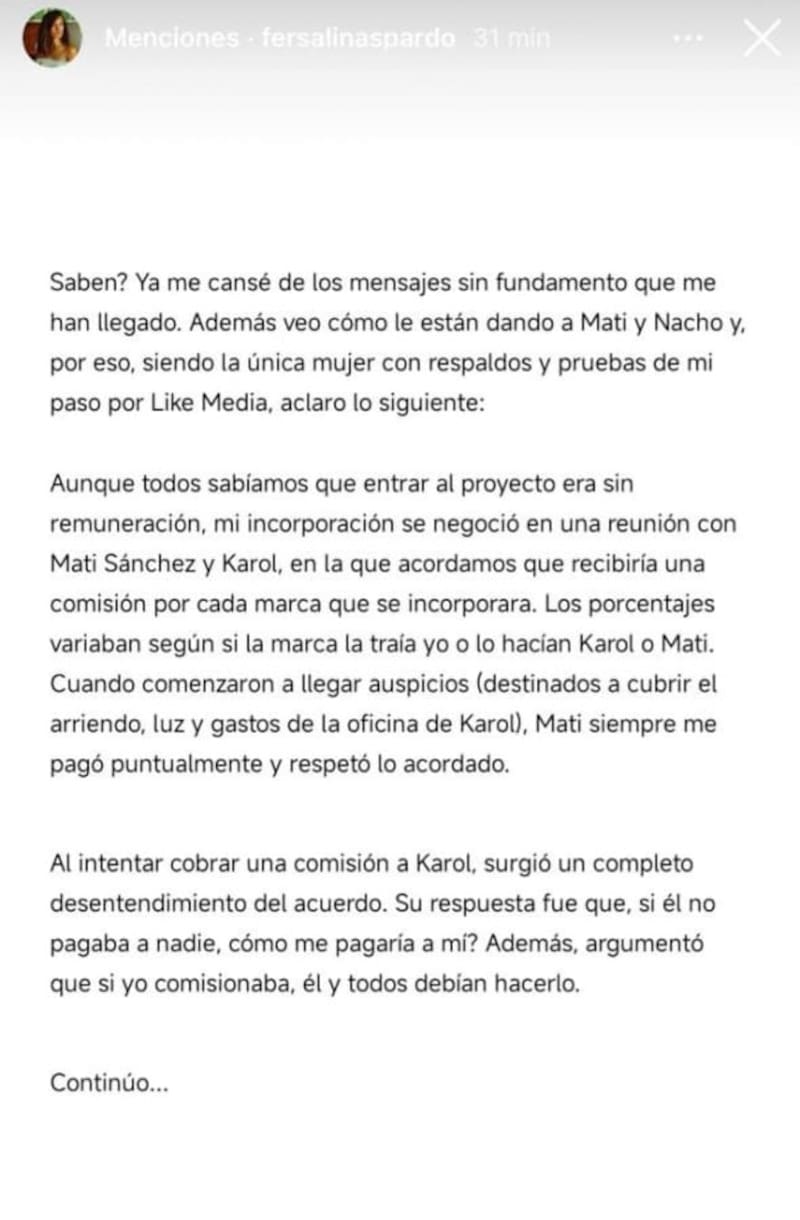 “Además, veo cómo le están dando a Mati y Nacho y, por eso, siendo la única mujer con respaldos y pruebas de mi paso por Like Media, aclaro lo siguiente: aunque todos sabíamos que entrar al proyecto era sin remuneración, mi incorporación se negoció con Mati Sánchez y Karol, en la que acordamos que recibiría una comisión por cada marca que incorporara”, inició.