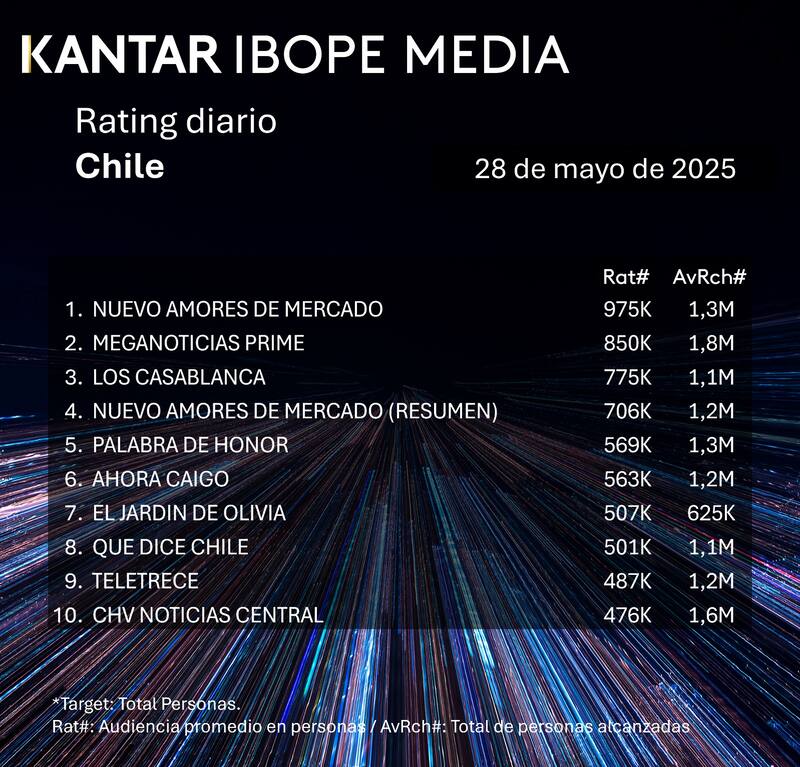 Pero eso no es todo, ya que el resumen de la nueva versión de Amores de Mercado -emitida originalmente en TVN en 2001- pasó del último al cuarto lugar de la lista con 706 mil televidentes y un alcance de 1,2 millones de telespectadores.