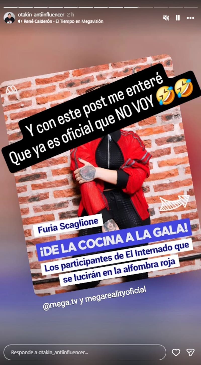 Luego, el participante del reality de Mega compartió la publicación de Instagram del canal con la confirmación de los rostros invitados a la Gala. “Con este post me enteré que ya es oficial que no voy”, escribió.