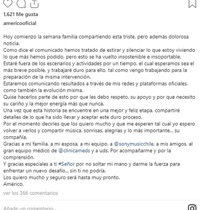 "Hemos tratado de estirar y silenciar lo que estoy viviendo lo que más hemos podido, pero esto se ha vuelto insostenible e insoportable. Estaré fuera de los escenarios y actividades por un tiempo", fue parte de lo que compartió el interprete en su Instagram.