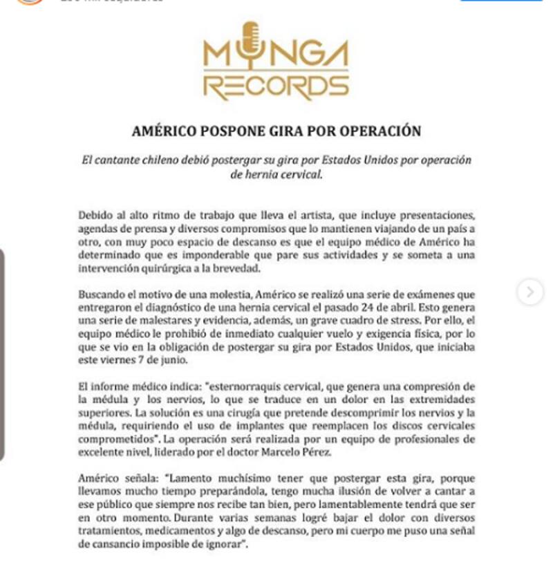 Hace ya un rato, Américo presenta "una serie de molestias" debido a la aparición de una hernia cervical, la cual le ha complicado su bienestar desde que se la diagnosticaron en abril pasado.