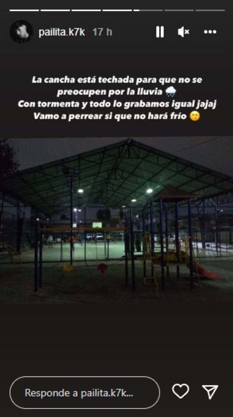 “Necesito que por favor lleven la camiseta de su equipo favorito, ya sea la Universidad de Chile, Colo Colo, la Católica, Everton, Cobreloa, etc. También llevar otra polera a parte que sea de la selección chilena. Mañana va a ser un día hermoso. No hay rivalidad, pura familia. Vayan todos los adultos, niños, jóvenes. Jugaremos su partido y todo mi xann”, señaló Pailita en sus historias afirmando que se realizaría a las 12 pm y que hasta con lluvia el evento iba, ya que el sector era techado.