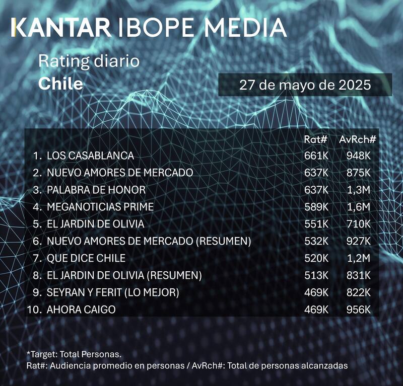 En la cuarta posición se ubicó Meganoticias Prime (589 mil personas), seguido por El jardín de Olivia (551 mil personas), el resumen de Nuevo Amores de Mercado (532 mil personas) y Qué dice Chile (520 mil personas).