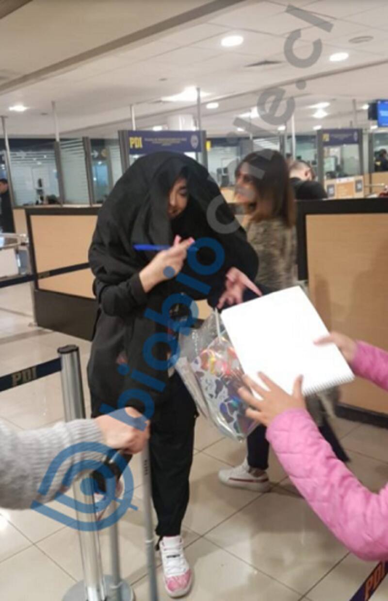 La cantante nacional fue fotografiada en el aeropuerto de Santiago mientras firmaba autógrafos a unos fanáticos.