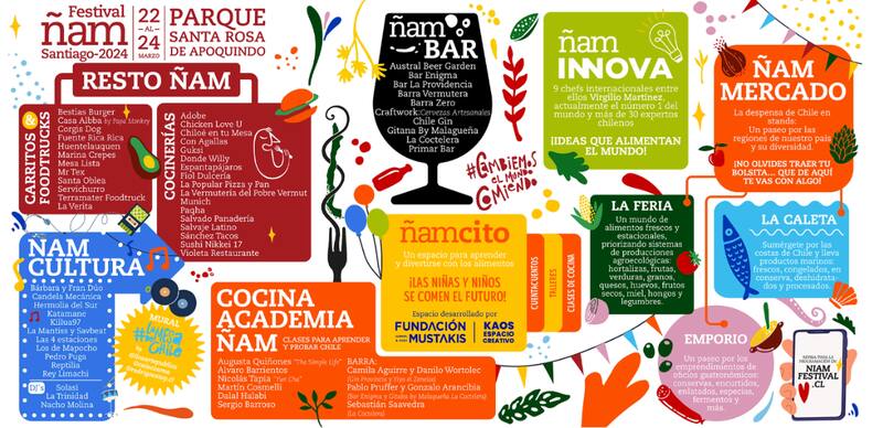 Ñam ofrece distintas secciones para poder disfrutar dentro del parque, desde Ñam Mercado, Ñam Innova, Resto Ñam y Ñamcito. Además, arribarán a Chile importantes invitadas e invitados internacionales como:
