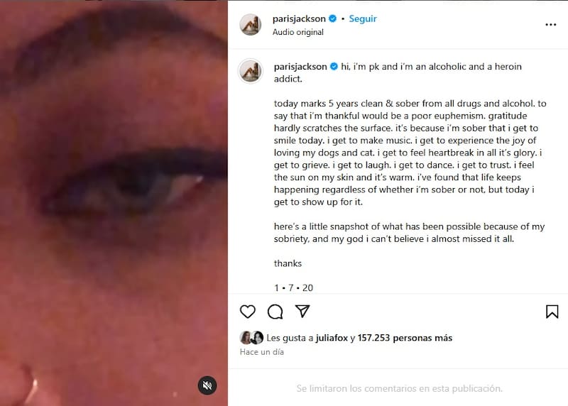 Por Consuelo CalderónParis Jackson celebró sus cinco años de sobriedad con emotivo video: “Soy alcohólica y adicta a la heroína”