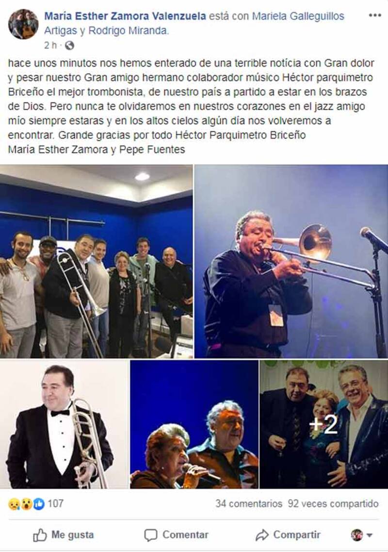 "Hace unos minutos nos hemos enterado de una terrible notícia con gran dolor y pesar. Nuestro gran amigo, hermano, colaborador músico, Héctor 'Parquímetro' Briceño, el mejor trombonista de nuestro país, ha partido a estar en los brazos de Dios. Pero nunca te olvidaremos en nuestros corazones. En el jazz amigo mío siempre estarás y en los altos cielos algún día nos volveremos a encontrar. Grande, gracias por todo Héctor 'Parquímetro' Briceño", posteó Zamora.