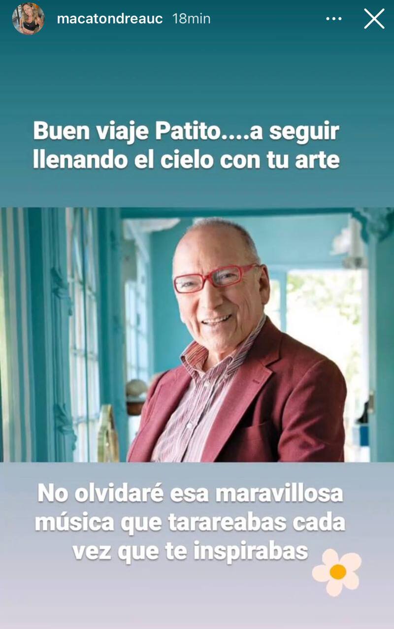 "Buen viaje, Patito. A seguir llenando el cielo con tu arte. No olvidaré esa maravillosa música que tarareabas cada vez que te inspirabas", complementó por su parte Maca Tondreau, quien también le dedicó un mensaje en el cibermundo.