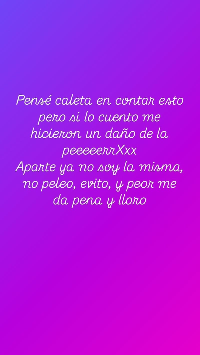 “Pensé caleta en contar esto, pero sí lo cuento. Me hicieron un daño de la pe... Aparte ya no soy la misma. No peleo, evito y peor, me da pena y lloro”, añadió.