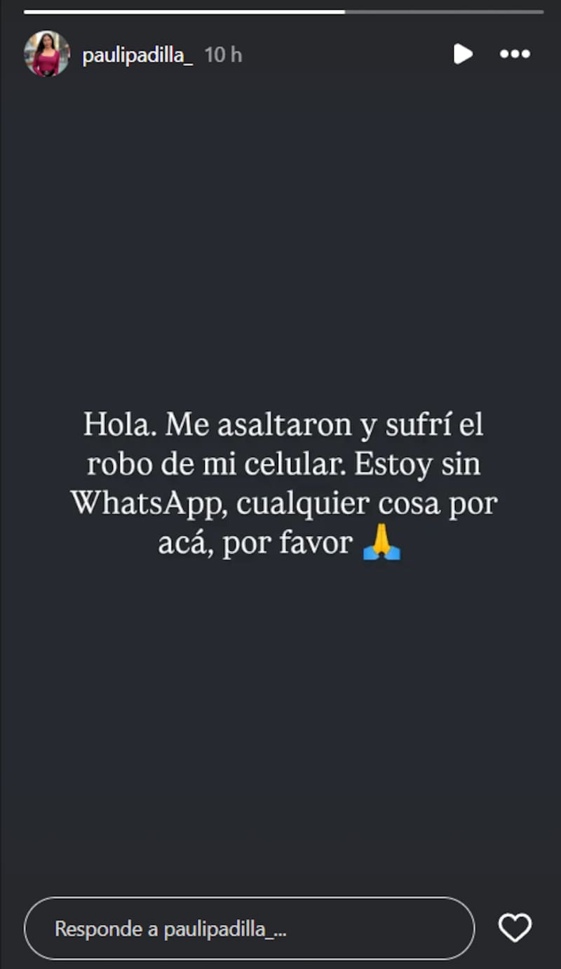 “Hola. Me asaltaron y sufrí el robo de mi celular. Estoy sin Whatsapp. Cualquier cosa por acá, por favor”, advirtió anoche la comunicadora en su cuenta de Instagram.
