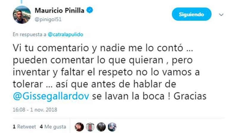 Pero claro, como estaba molesto con la situación, posteriormente también le contestó a Cata Pulido. "Vi tu comentario y nadie me lo contó ... pueden comentar lo que quieran , pero inventar y faltar el respeto no lo vamos a tolerar ... así que antes de hablar de @Gissegallardov se lavan la boca ! Gracias", avisó.