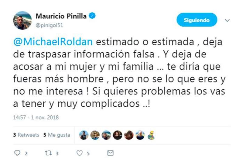 "Estimado o estimada, deja de traspasar información falsa . Y deja de acosar a mi mujer y mi familia. Te diría que fueras más hombre, pero no se lo que eres y no me interesa", fue el ácido tuiteo que le envió "Pinigol".