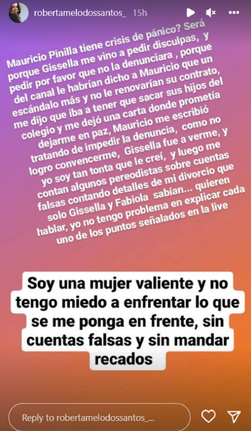 Tras esto, Roberta decidió volcarse a sus redes sociales para entregar su versión de los hechos y denunciar lo sucedido con Gisella, además de hablar sobre Mauricio Pinilla.