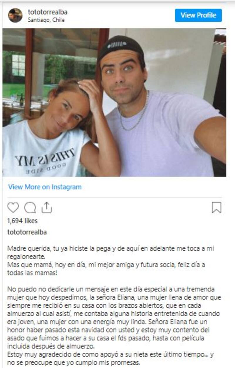 Pero quien tampoco quiso estar ausente fue Toto Torrealba, el pololo de la estudiante de derecho, quien también a través de sus redes sociales le dedicó palabras a Eliana. Junto con dedicarle un mensaje a su madre, mencionó a la abuela de su pareja.