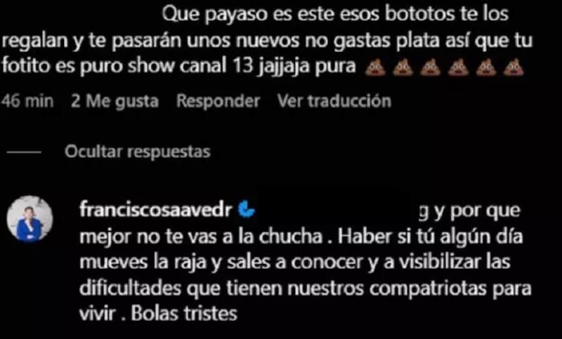 Por Juan Carlos Muñoz“¿Por qué no te vas a la chu…?”: Pancho Saavedra perdió la paciencia con usuario que le lanzó ácido comentario en Instagram
