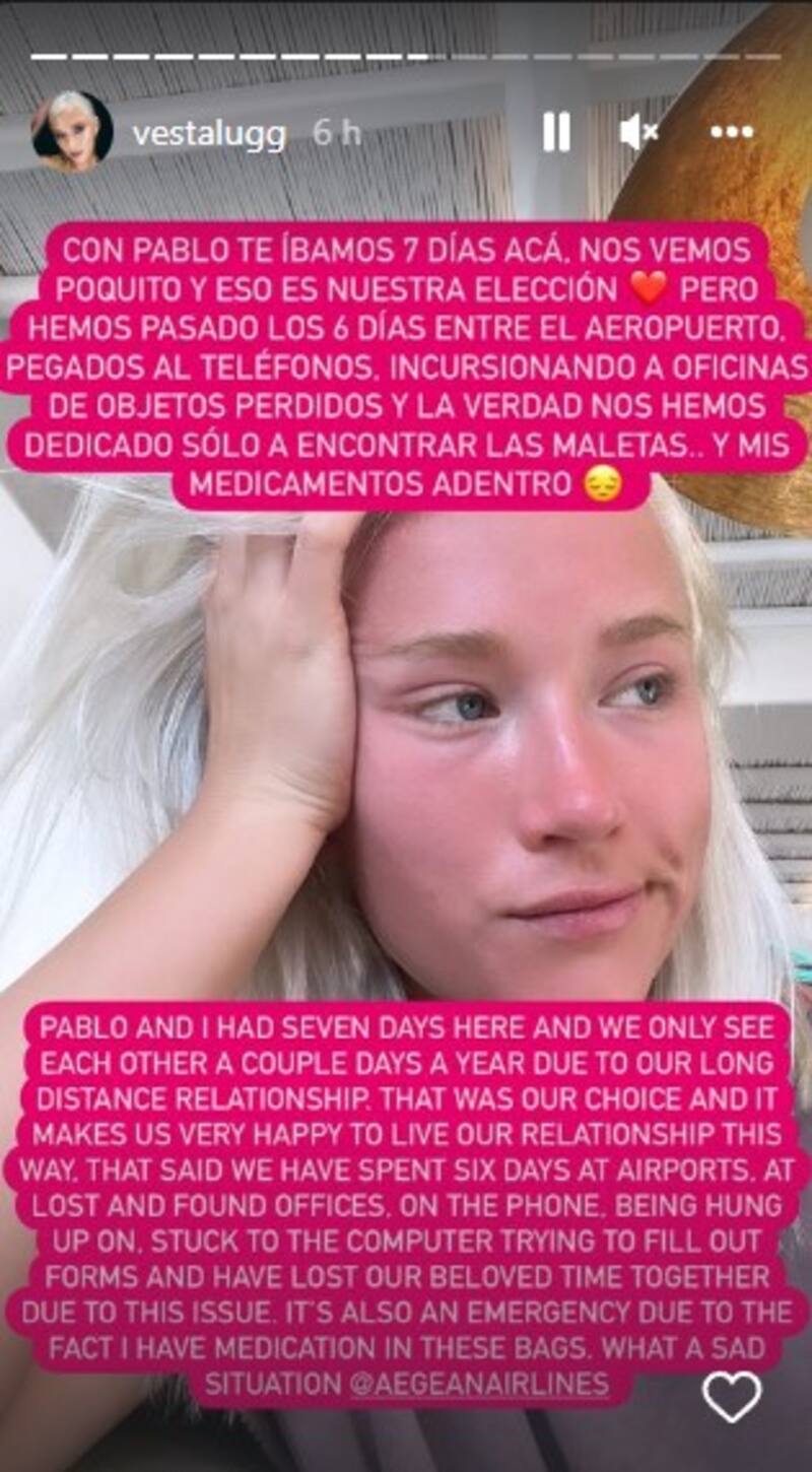 “Con Pablo llevamos 7 días acá. Nos vemos poquito y eso es nuestra elección, pero hemos pasado los 6 días entre el aeropuerto pegados al teléfono, incursionando a oficinas de objetos perdidos y la verdad nos hemos dedica sólo a encontrar las maletas… y mis medicamentos adentro”, afirmó la influencer en otro registro donde dejó en evidencia su tristeza, sin poder recibir buenas noticias.