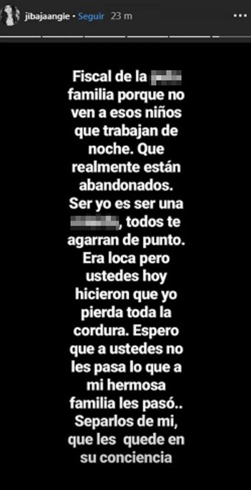 Luego agregó: "Fiscal de la p... familia porque no ven a esos niños que trabajan de noche. Que realmente están abandonados. Ser yo es ser una..., todos te agarran de punto. Era loca pero ustedes hoy hicieron que yo pierda toda la cordura. Espero que a ustedes no les pasa lo que a mi hermosa familia le pasó.. Separarlos de mí, que les quede en su conciencia".