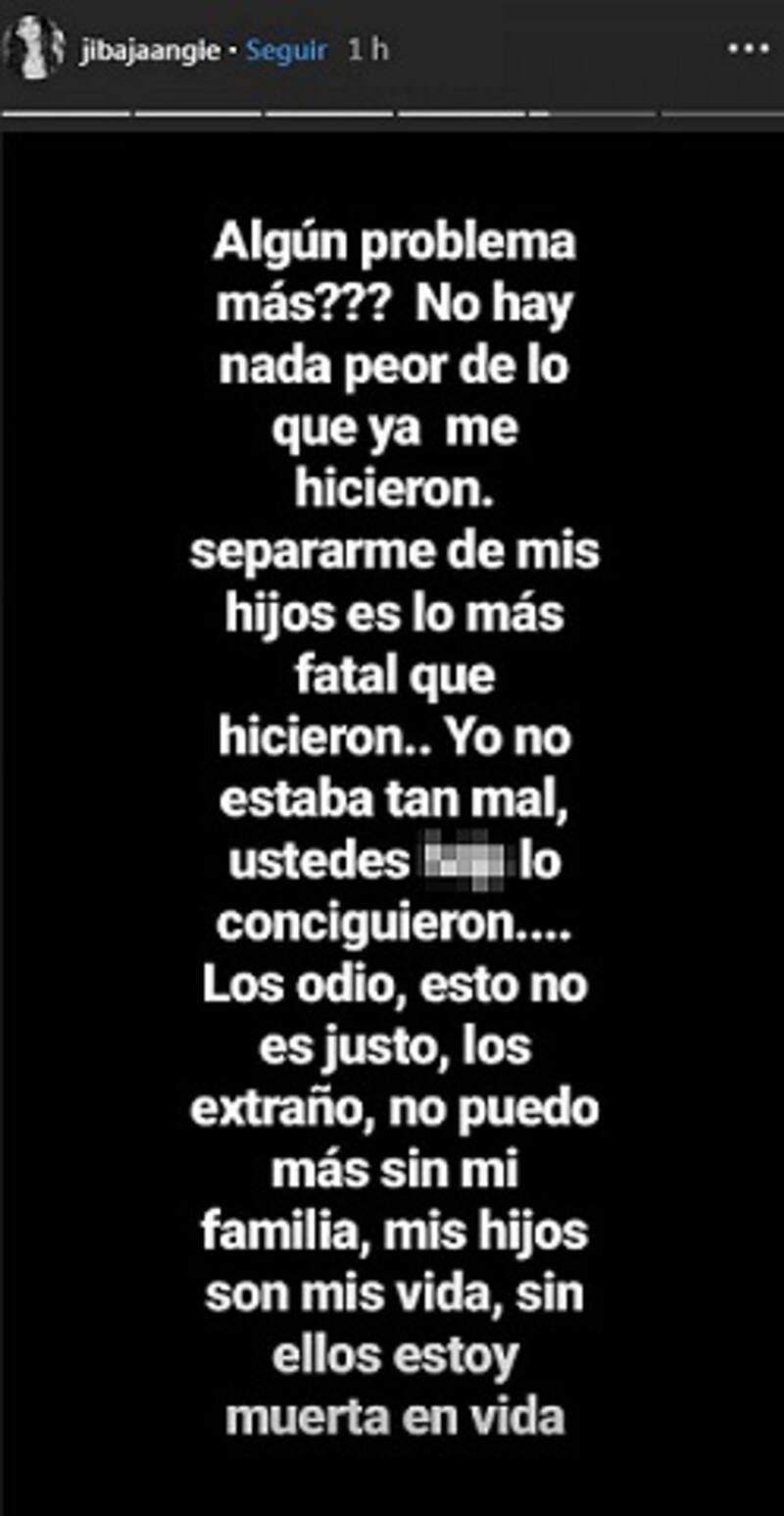 Ahora sobrepasó todas las expectativas. Incluso, subió una serie de historias a su Instagram donde relataba el dolor por el que estaba pasando: "Algún problema más??? No nada peor de lo que ya me hicieron. separarme de mis hijos es lo más fatal que hicieron. Yo no estaba tan mal, ustedes lo consiguieron.... Los odio, esto no es justo, los extraño, no puedo más sin mi familia, mis hijos son mis vida, sin ellos estoy muerta en vida", decía una de las historias de la actriz.