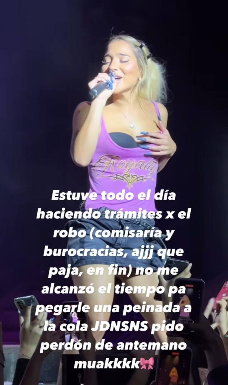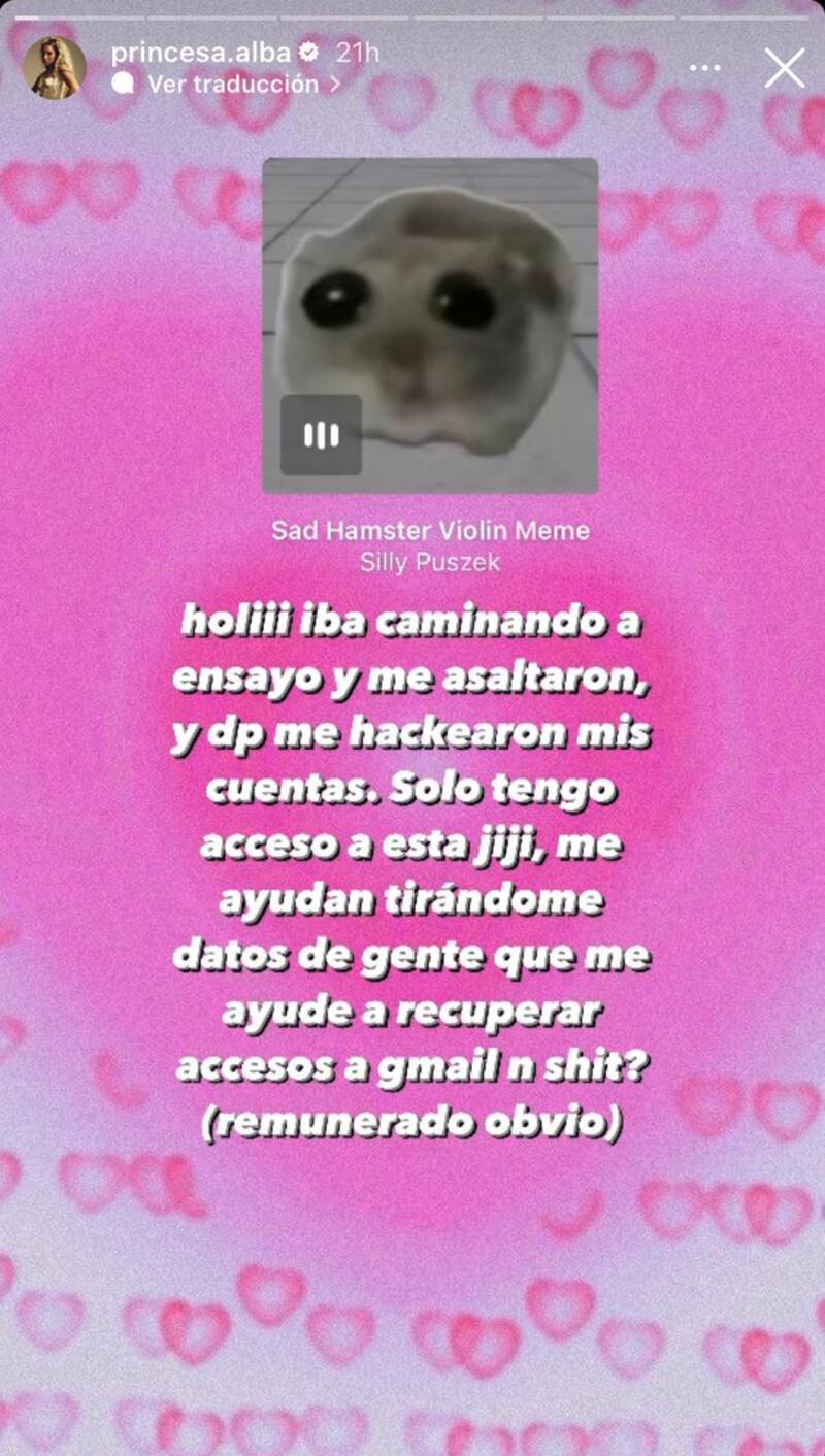 “Iba caminando a ensayo y me asaltaron, después me hackearon mis cuentas. Solo tengo acceso a esta (Instagram), ¿me ayudan tirándome datos de gente que me ayude a recuperar accesos a Gmail?”, dijo a través del post.