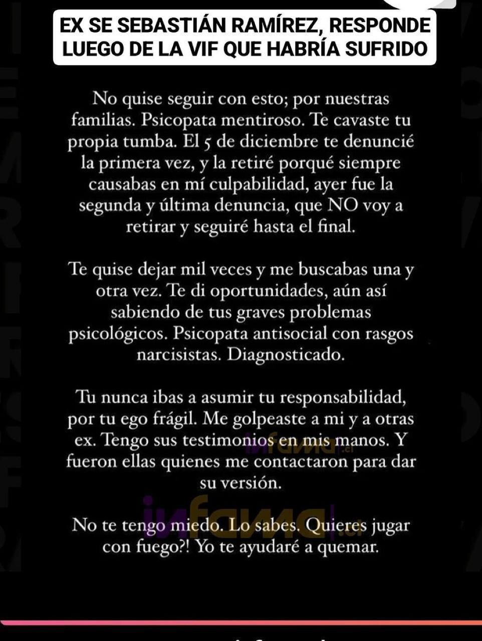Su expareja Catalina Gaete, no se quedó callada y salió a desmentir a Ramírez. En sus stories reveló detalles de la relación tóxica que llevaban, lo acusó de narcisista y mentiroso.