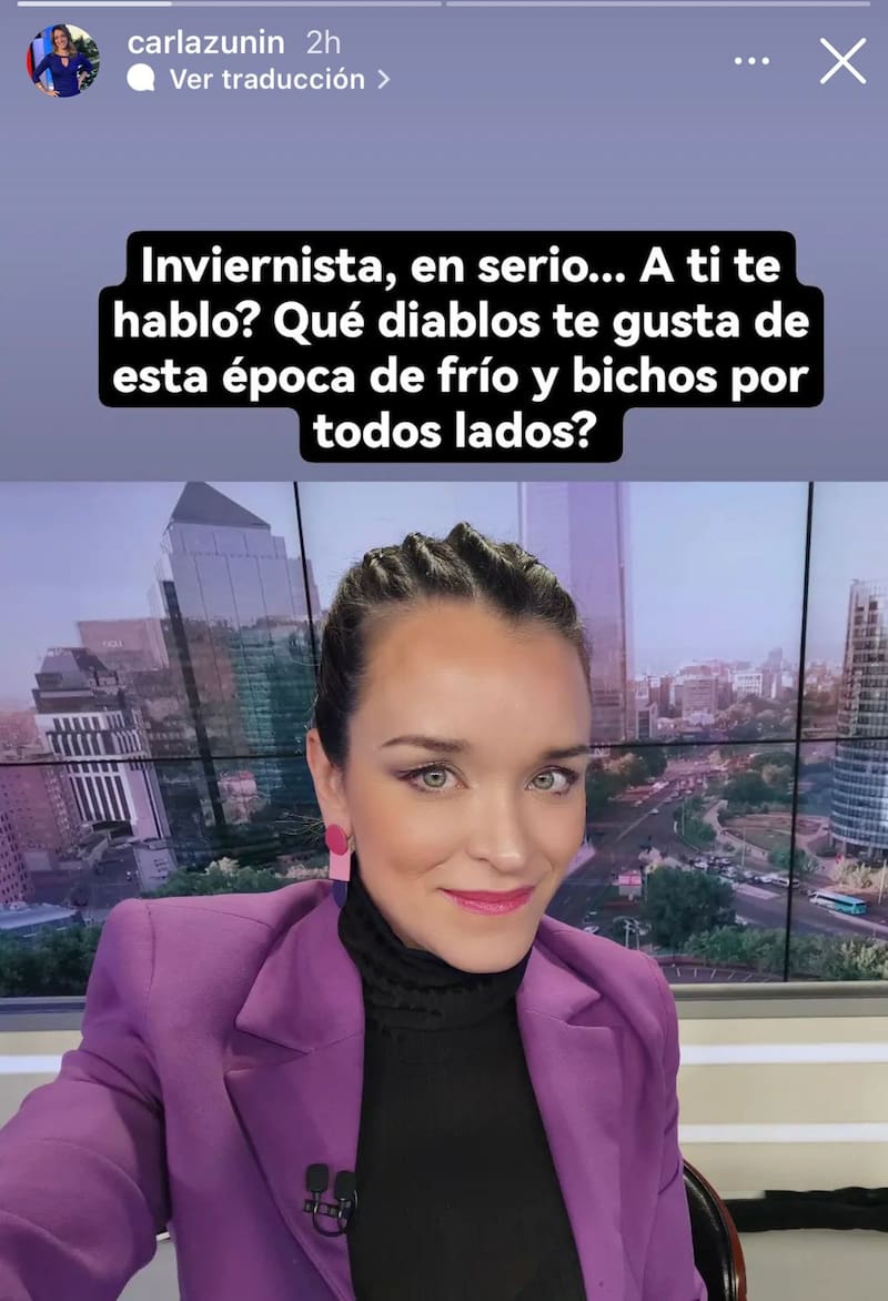 “Invernista, en serio... A ti te hablo. ¿Qué diablos te gusta de esta época de frío y bichos por todos lados?”, escribió en las stories junto a una foto donde aparece en los estudios de TVN y más abrigada que hijo único.