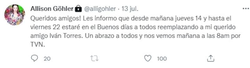 Ahora, y luego de su larga trayectoria, la oriunda de San Antonio estará al menos hasta el viernes 22 de julio en el Buenos Días a Todos, tal como lo anunció en sus redes sociales.
