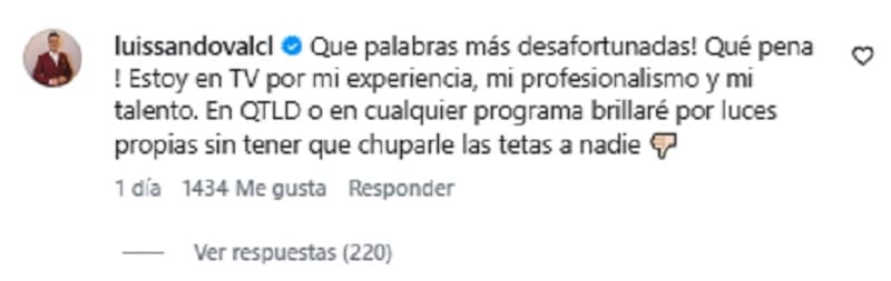 “En QTLD o en cualquier programa brillaré por luces propias sin tener que chuparle las tetas a nadie”, agregó Sandoval, junto con un emoji de un dedo hacía abajo.