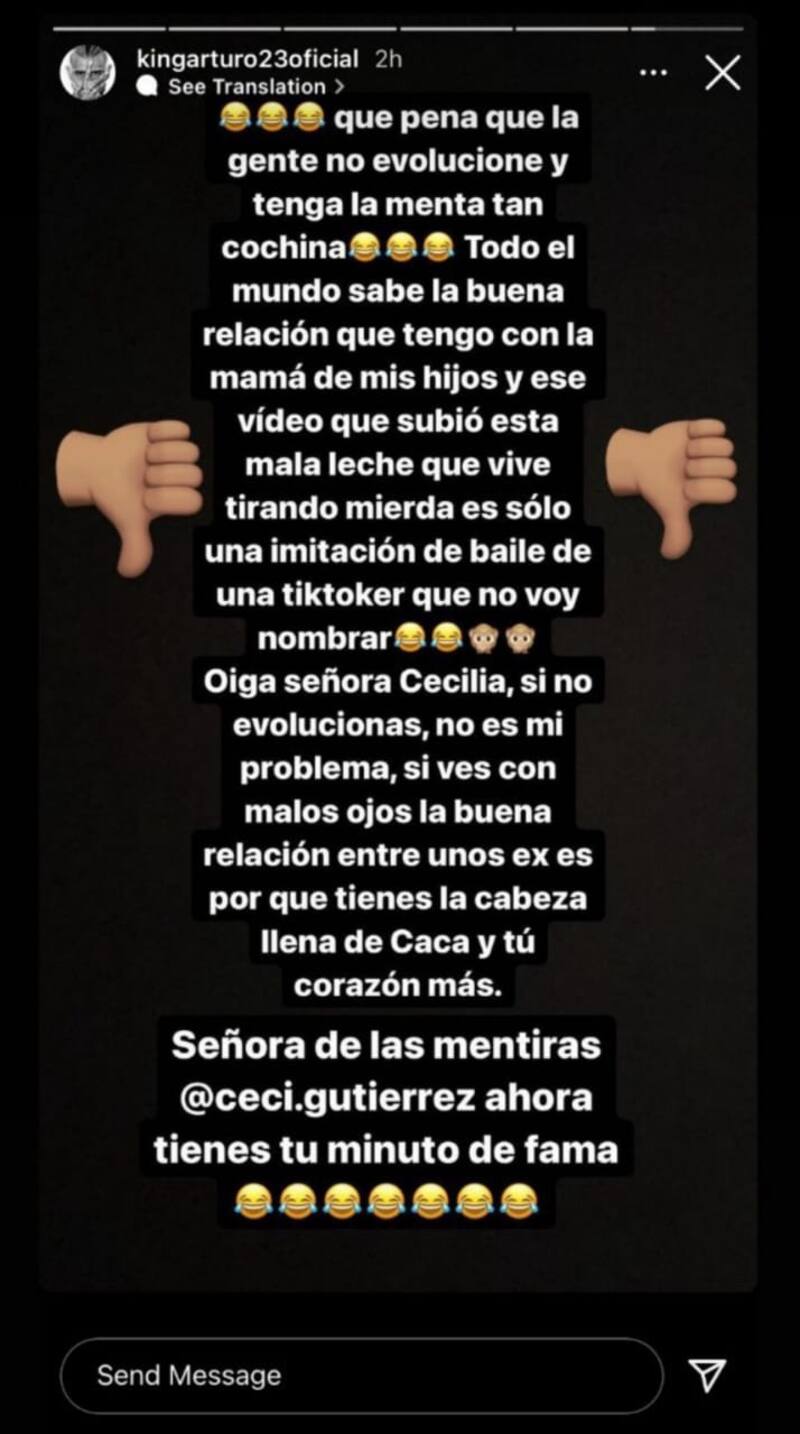 “Oiga señora Cecilia, si no evolucionas, no es mi problema. Si ves con malos ojos la buena relación, es porque tienes la cabeza llena de caca y tu corazón también. Señora de las mentiras… ahora tienes tu minuto de fama”, añadió el “King” con molestia.