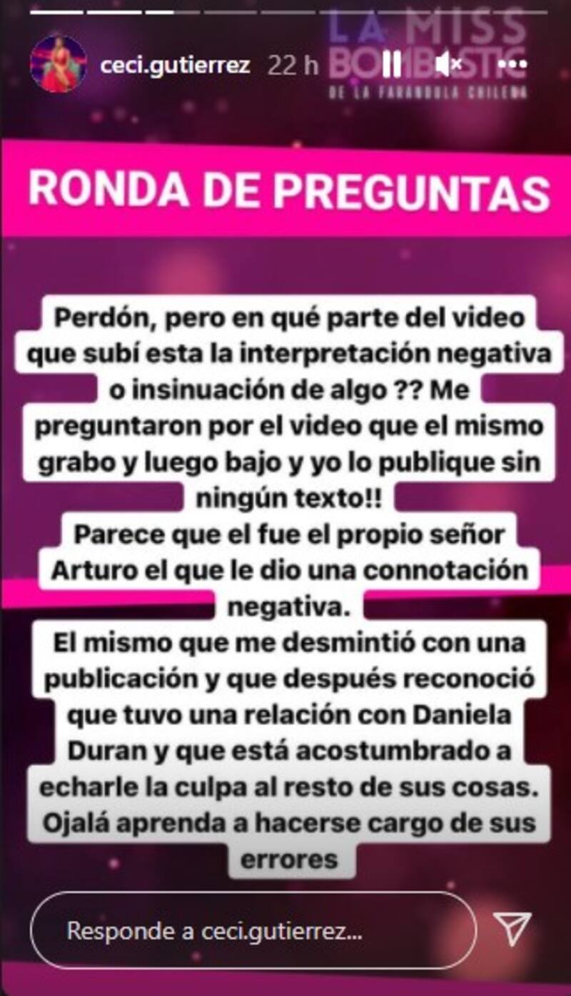 “Me preguntaron por el video que el mismo grabó y luego bajó, y yo lo publiqué sin ningún texto. Parece que fue el propio señor Arturo el que le dio una connotación negativa”, expresó Gutiérrez recordándole una polémica del pasado cuando ella compartió su romance con Daniella Durán, algo que el futbolista desmintió y posteriormente confirmó en la web.