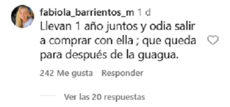 “Llevan 1 año juntos y odia salir a comprar con ella; que queda para después de la guagua”, “Qué tipo más brusco y ella lo toma como algo divertido”, “Lo mejor es ir sola … a los hombres les carga ir de shopping”, “Se supone que se aman ohh el amooorr y él se aburre con ella”, fueron algunos de los comentarios que surgieron.
