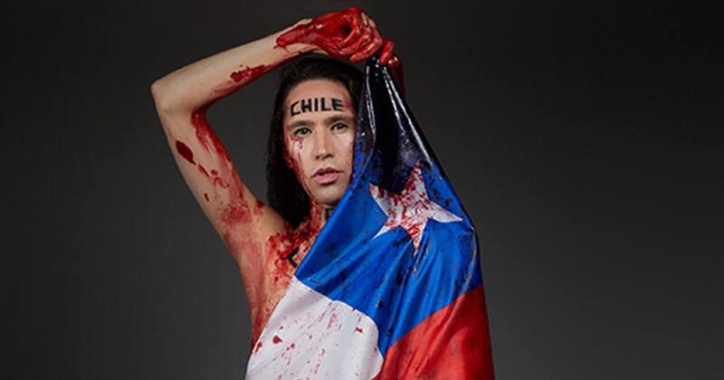 En la fotografía aparece el fashionista posando con una bandera chilena, con su cuerpo simulando sangre y además con las palabras libertad, justicia, felicidad, amor, con su cuerpo desnudo.