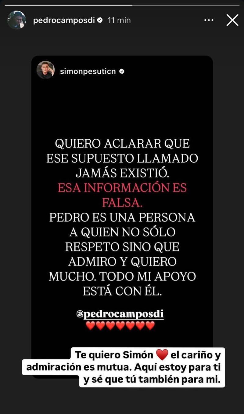 Para reafirmar esta versión, Simón escribió un mensaje en sus redes sociales: ”Quiero aclarar que este supuesto llamado jamás existió. Esa información es falsa. Pedro es una persona a quien no solo respeto, sino que admiro y quiero mucho. Todo mi apoyo está con él”, añadió etiquetándolo y llenándolo de corazones en esa misma historia de Instagram.