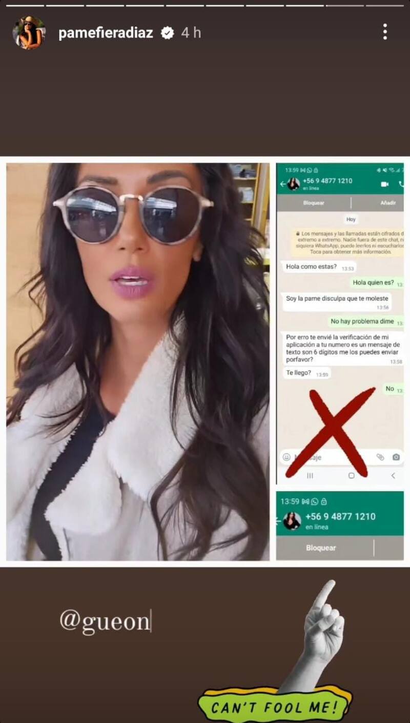 Durante la tarde de este miércoles Pamela Díaz usó su cuenta de Instagram para denunciar a personas que se están haciendo pasar por ella a través de WhatsApp con el propósito de realizar estafas y probablemente pedir dinero.