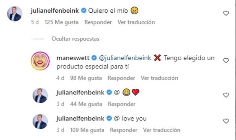 “Quiero el mío”, expresó Elfenbein con un emoji llorando, mientras que Swett reaccionó con un “Tengo elegido un producto especial para ti”, sorprendiendo con su mensaje.