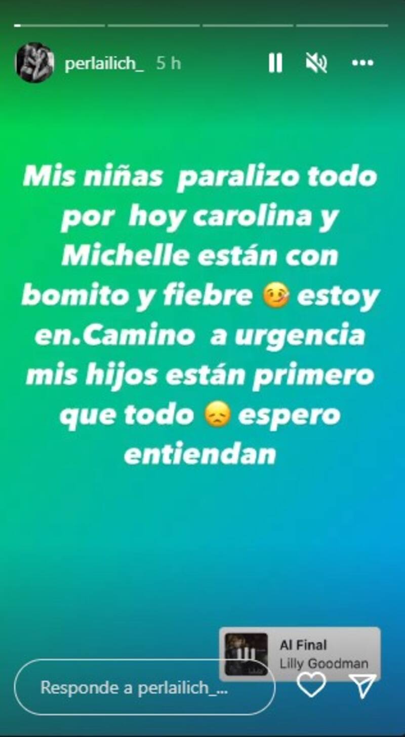 “Mis niñas… paralizo todo por hoy. Carolina y Michelle están con vómito y fiebre. Estoy en camino a urgencia. Mis hijos están primero que todo, espero entiendan”, detalló en la red social compartiendo posteriormente registros en un centro médico.
