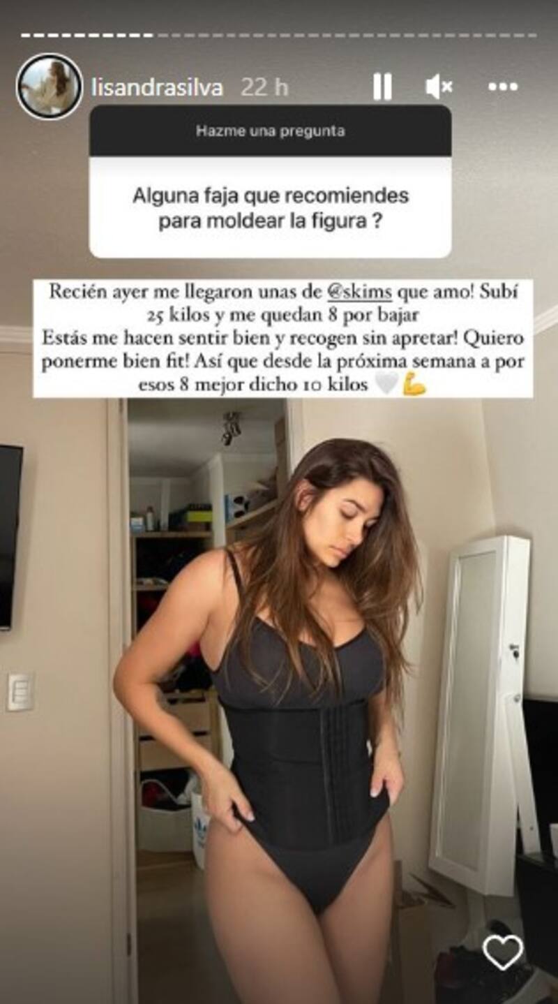 “Subí 25 kilos y me quedan 8 por bajar. Estas me hacen sentir bien y recogen sin apretar! Quiero ponerme bien fit! Así que desde la próxima semana a por esos 8 mejor dicho 10 kilos”, señaló Lisandra Silva sorprendiendo a sus seguidores.