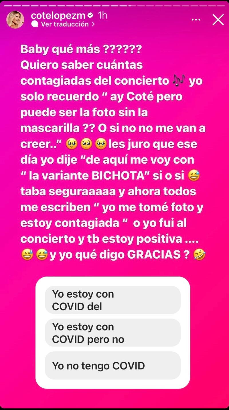 “Quiero saber cuántas contagiadas del concierto (de Karol G). Yo solo recuerdo (que se le acercaban a pedirle una selfie, y le decían) ‘ay, Coté, pero puede ser la foto sin mascarilla? O si no no me van a creer’. Les juro que ese día yo dije ‘de aquí me voy con la variante Bichota sí o sí’”.
