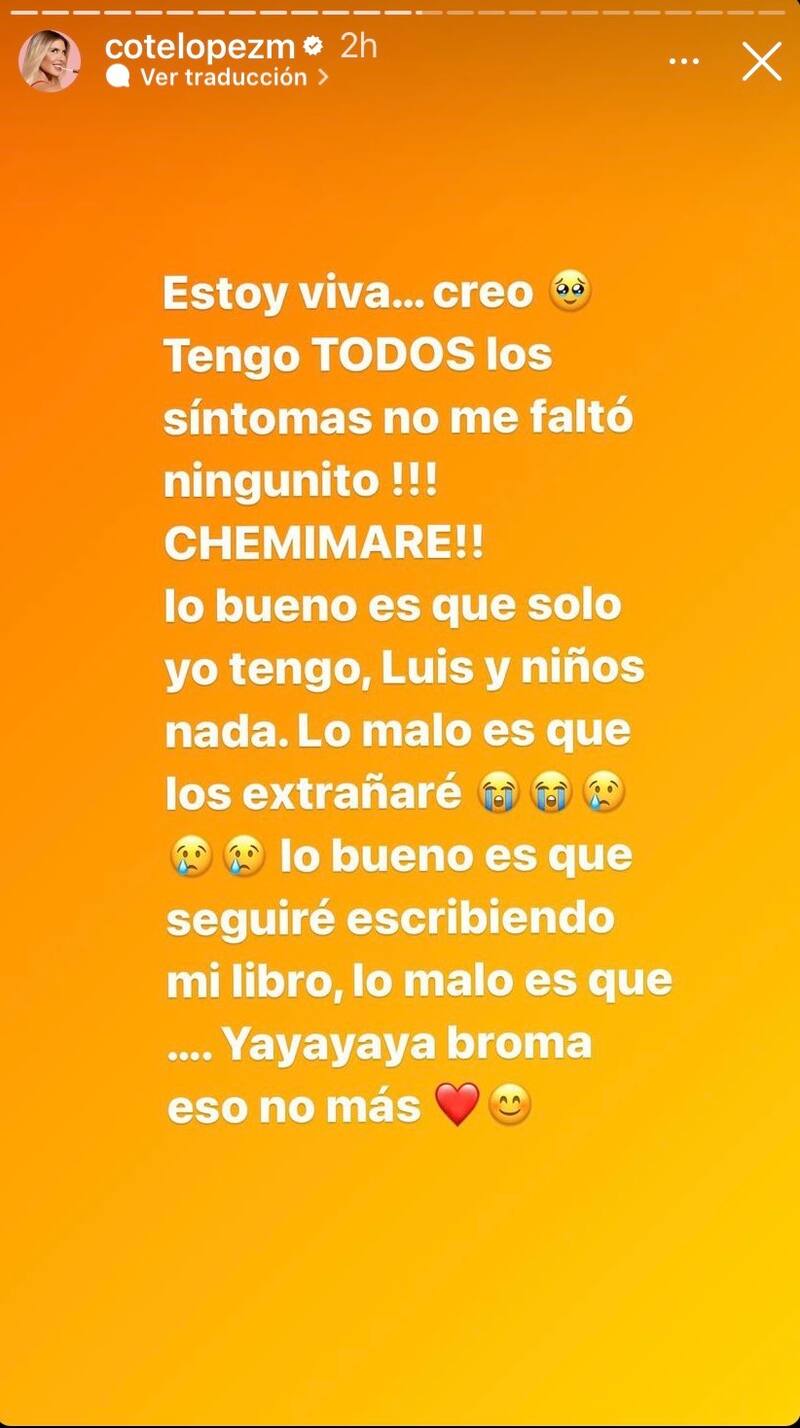 “Moraleja: María fue a un concierto y no usó mascarilla. María se contagió. Usted no sea tonto, no haga como María”, escribió este martes en Instagram, donde también dejó un par de historias reconociendo que se sentía muy mal físicamente.