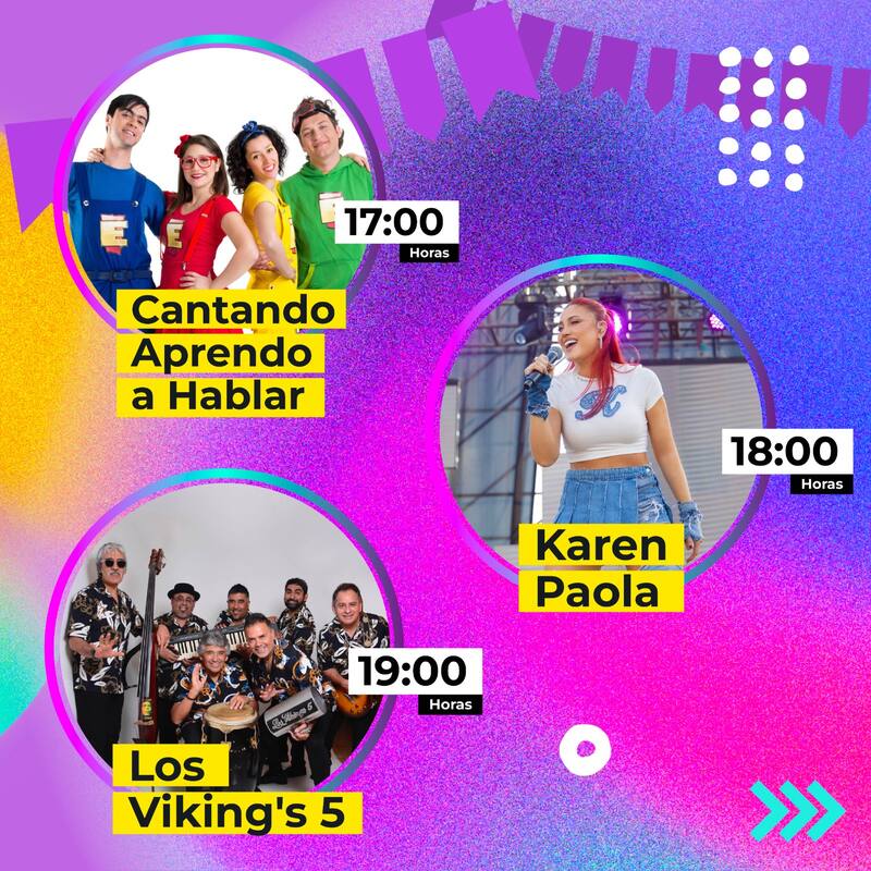 Cantando Aprendo a Hablar se presentarán a las 17:00 horas. Después a las 18:00 horas, Karen Paola conquistará al público. A las 19:00 horas la cumbia llegará de mano de Los Vinking’s 5, también gozarán de lo mejor de Axé Bahía a las 20:00 horas y finalmente este evento lo cerrará Rafagá a las 21:00 horas.